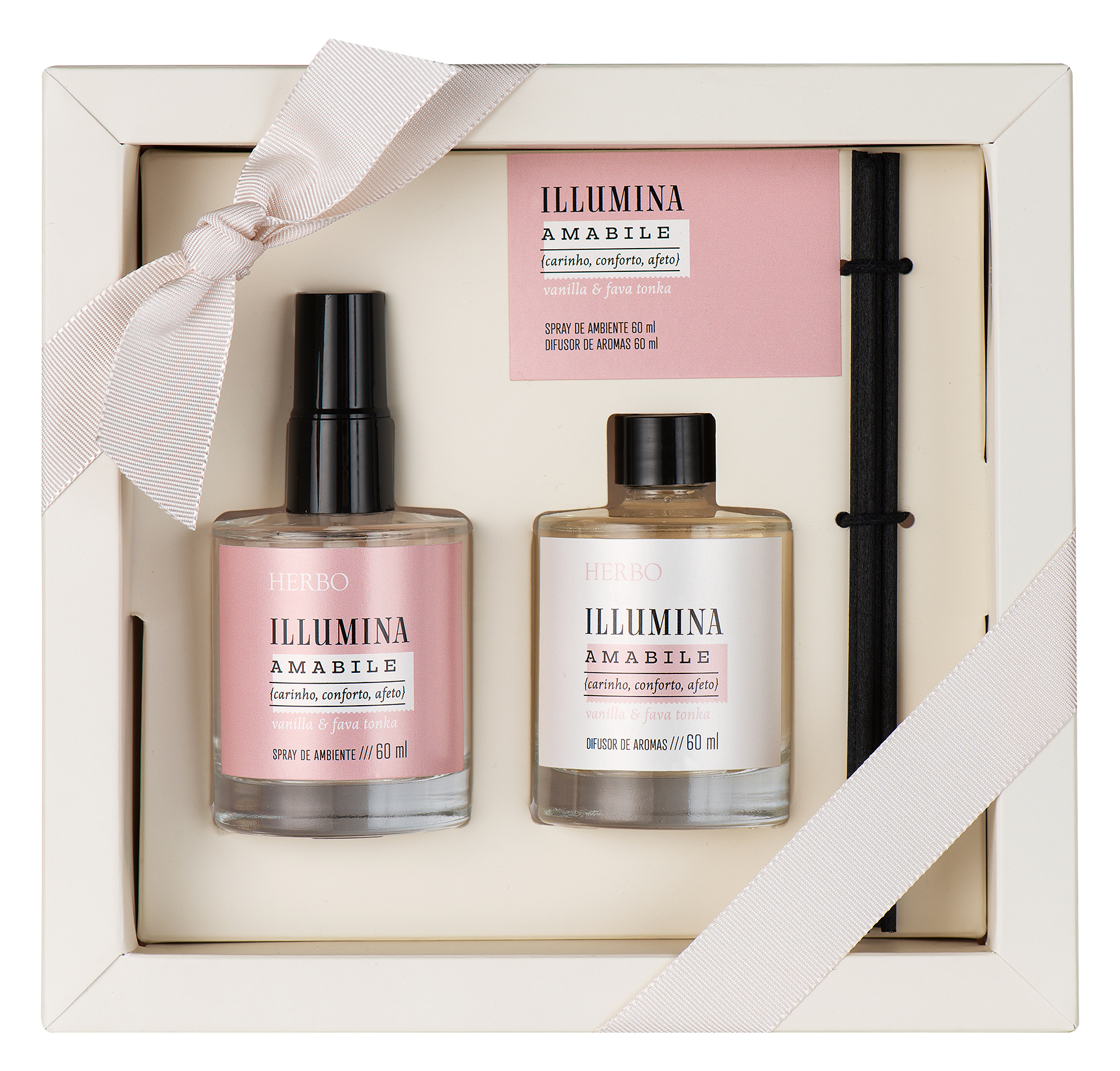 Kit com mini spray e mini difusor de 30 ml cada, com caixa.