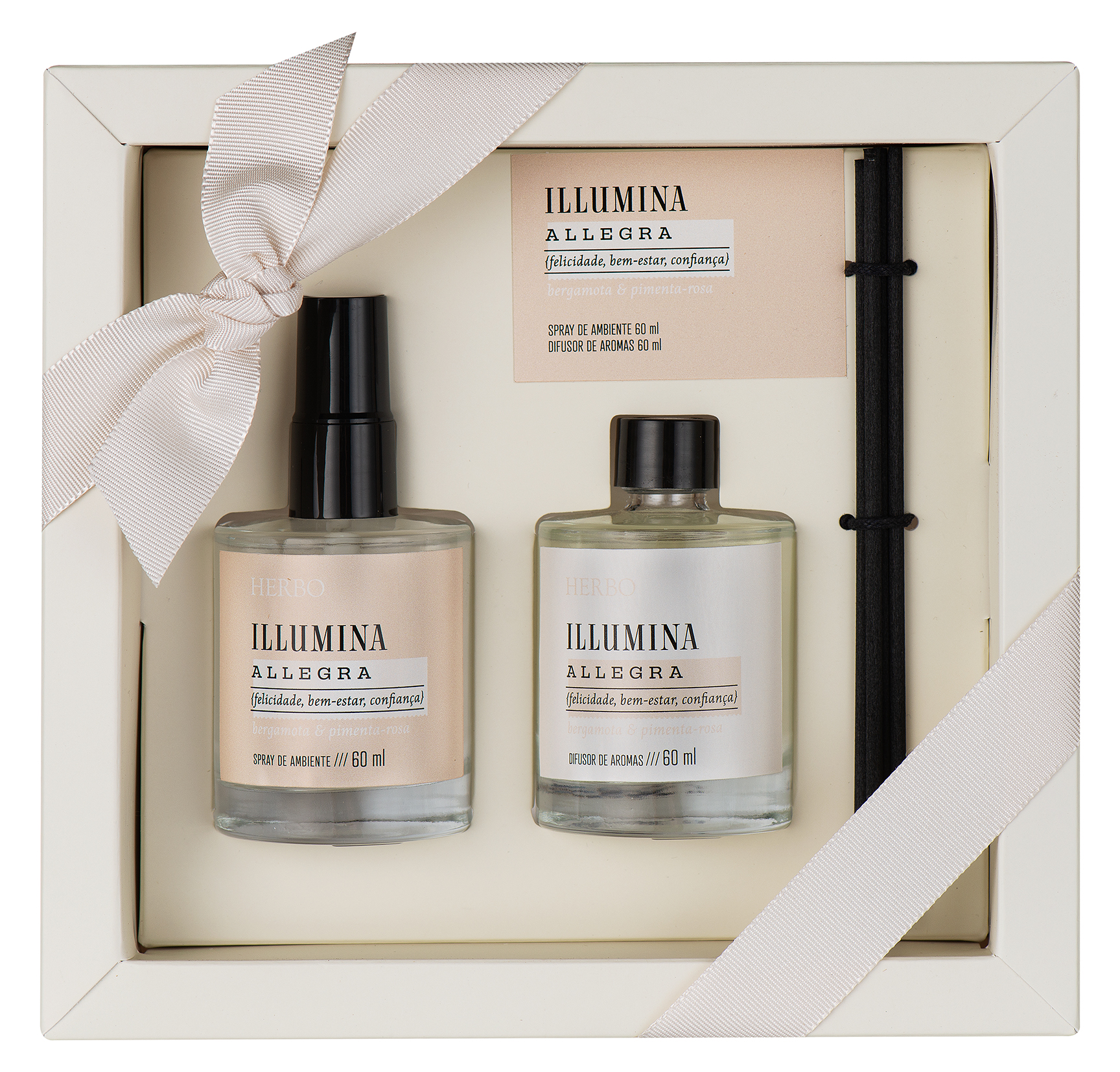 Kit com mini spray e mini difusor de 30 ml cada, com caixa.
