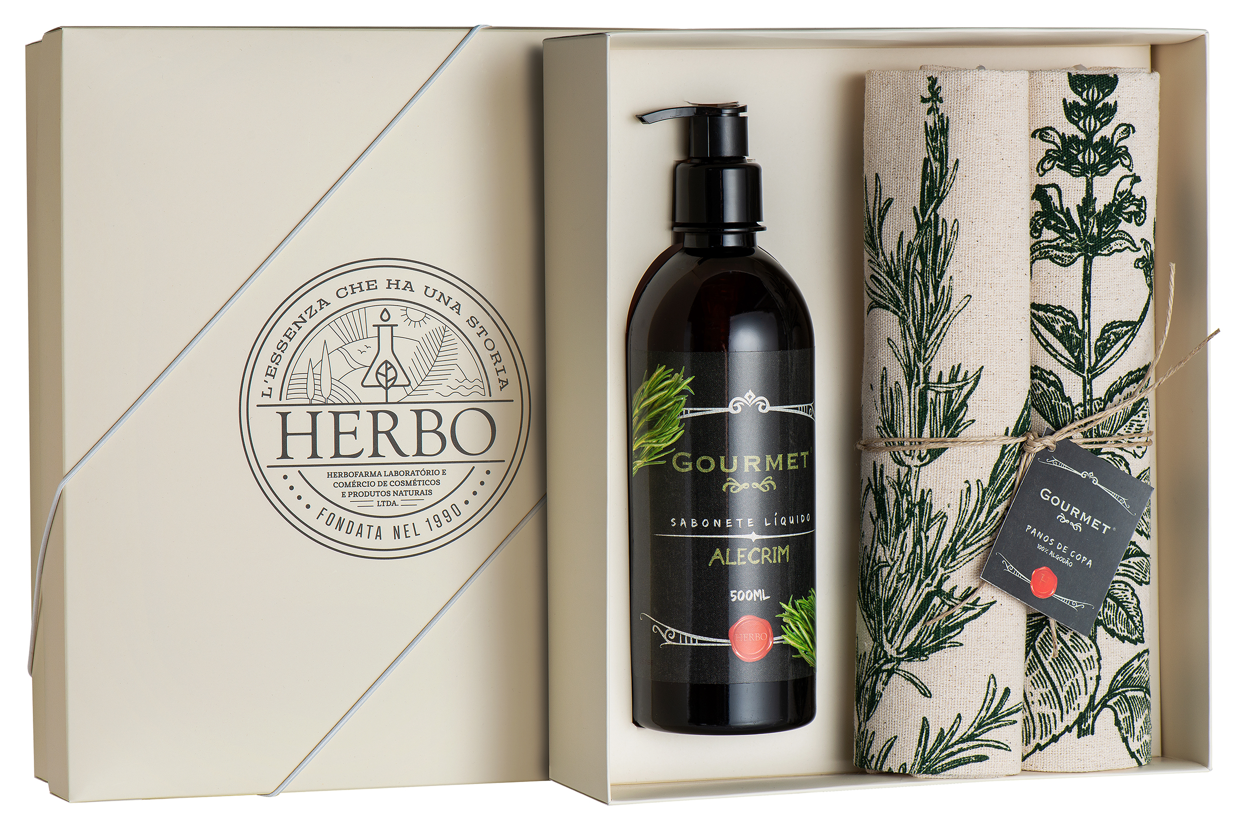 Kit contém 1 Sabonete Líquido Alecrim 500ml e 1 Toalha decorada.